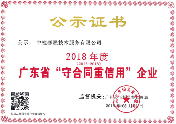 日前,廣東省市場監督管理局正式公示了2018年度“廣東省守合同重信用企業”名單,中檢賽辰技術服務有限公司憑借良好的信譽與契約精神順利通過評審,已連續四年(2015-2018)獲得此項殊榮,同時彰顯了中檢賽辰企業的信用體系建設及維護合同信用等方面得到工商和市場監管部門的高度認可。