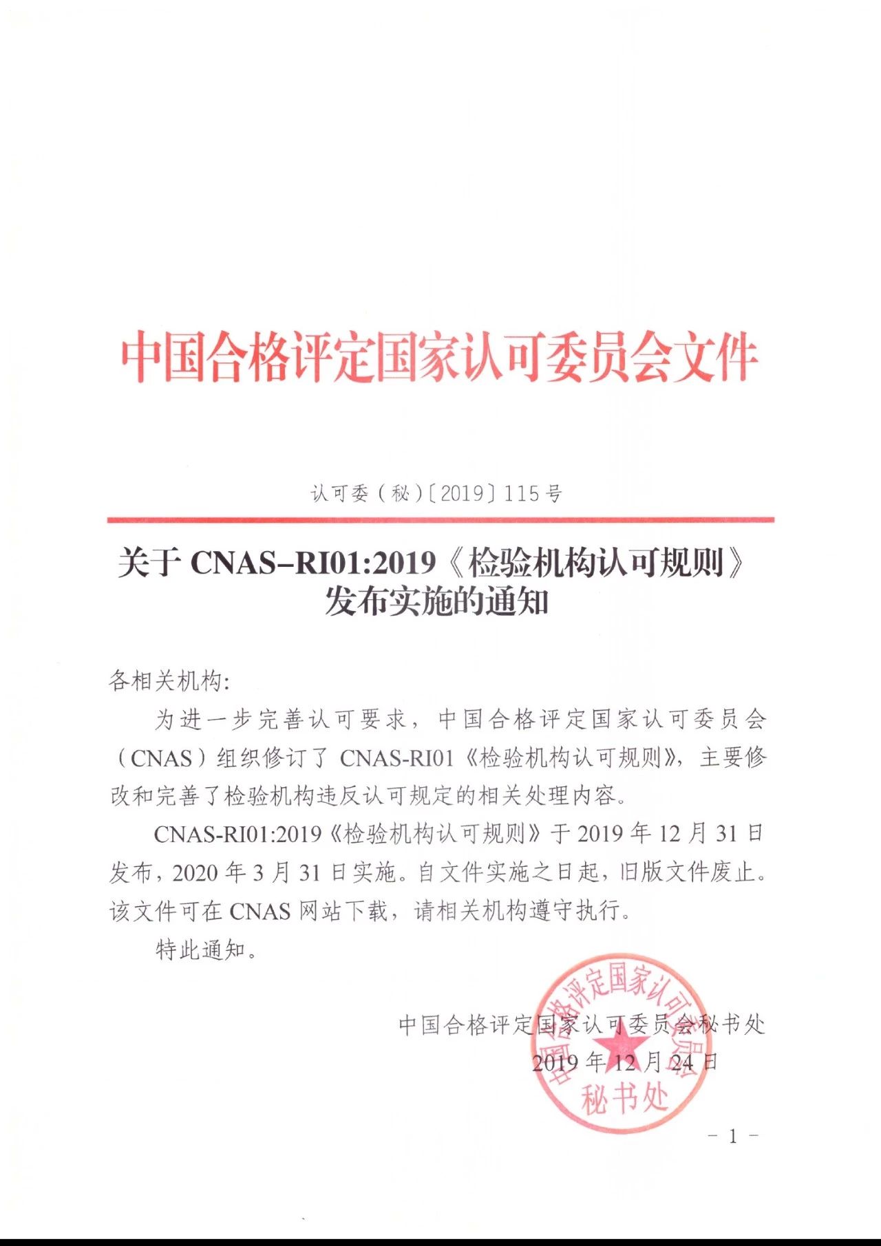 關于CNAS-RI01:2019《檢驗機構認可規則》發布實施的通知