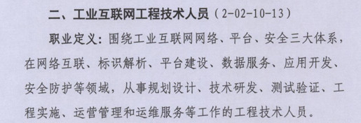 工業(yè)互聯(lián)網(wǎng)是新出來的業(yè)態(tài),工業(yè)互聯(lián)網(wǎng)工程技術(shù)人員的職業(yè)定義是:圍繞工業(yè)互聯(lián)網(wǎng)網(wǎng)絡(luò)、平臺、安全三大體系,在網(wǎng)絡(luò)互聯(lián)、標識解析、平臺建設(shè)、數(shù)據(jù)服務、應用開發(fā)、安全防護等領(lǐng)域,從事規(guī)劃設(shè)計、技術(shù)開發(fā)、測試驗證、工程實施、運營管理和運維服務等工作的工程技術(shù)人員。