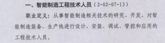 像《通告》里的智能制造工程技術(shù)人員,職業(yè)定義為:從事智能制造相關(guān)技術(shù)的研究、開發(fā)、對智能制造裝備、生產(chǎn)線進行設(shè)計、安裝、調(diào)試、管控和應用的工程技術(shù)人員。