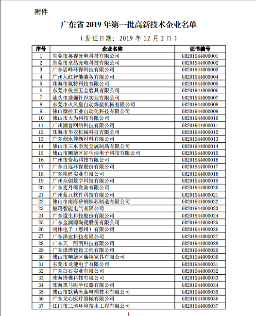 你們上報的《關于廣東省2019年高新技術企業認定備案的函》(粵科函高字〔2019〕1730號)收悉。現將公示無異議的東莞市英睿光電科技有限公司等3202家企業予以高新技術企業備案。請你們按照《廣東省2019年第一批高新技術企業名單》(詳見附件)中的企業名稱、高新技術企業證書編號和發證日期打印并頒發“高新技術企業證書”。