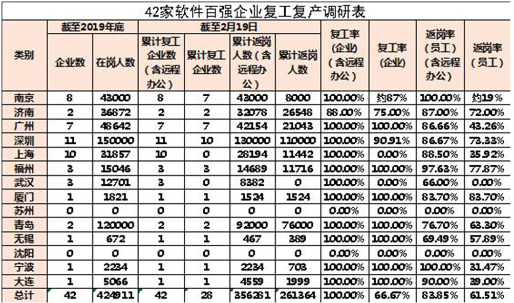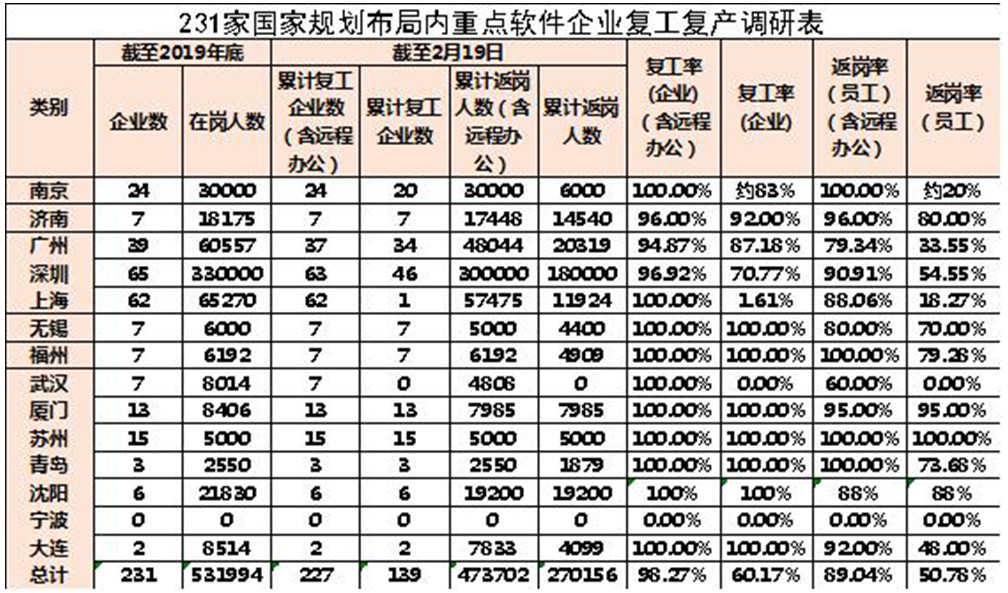 據中國電子信息產業發展研究院賽迪智庫信息化與軟件產業研究所監測,截至2月19日,南京、濟南、廣州、深圳、上海5個綜合型中國軟件名城,福州、武漢、廈門、蘇州、青島5個特色型中國軟件名城,無錫、沈陽、寧波、大連4個創建試點城市,納統企業共計15910家,復工13012家,復工率81.79%,累計返崗(含遠程辦公)2189574人,返崗率達80.88%,到崗1097843人,到崗率達40.55%;其中42家軟件百強企業已全部復工,累計返崗(含遠程辦公)356218人,返崗率達83.85%,到崗261364人,到崗率達61.51%;國家規劃布局內重點軟件企業231家,復工227家,復工率98.27%,累計返崗(含遠程辦公)473702人,返崗率達89.04%,到崗270156人,到崗率達50.78%。