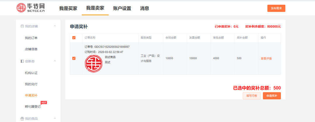 服務(wù)機(jī)構(gòu)登錄后,可在【用戶中心】--【我是賣家】---【申請獎(jiǎng)補(bǔ)】對已兌付的訂單申請獎(jiǎng)補(bǔ)。